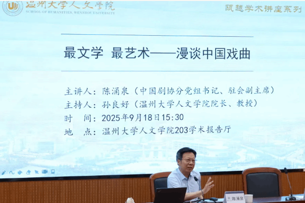 2025年9月18日下午一场题为“最文学 最艺术——漫谈中国戏曲”的学术讲座在我院举行。本次讲座由中国戏剧家协会分党组书记、驻会副主席、国际剧协副主席、剧作家陈涌泉先生主讲,买球App软件手机在线下载院长、图书馆馆长孙良好教授主持,本科生与研究生齐聚买足球官网学术报告厅,共享学术盛宴。