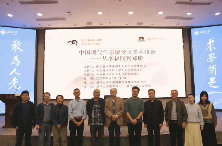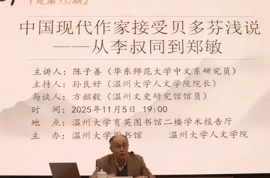 2025年11月5日晚,华中师范大学中文系研究员陈子善教授应邀在买足球的app软件推荐育英图书馆学术报告厅,作了一场题为“中国现代作家接受贝多芬浅说——从李叔同到郑敏”的专题讲座。本次讲座由买球App软件手机在线下载院长、图书馆馆长孙良好教授主持,温州文史研究馆馆员方韶毅与买足球官网教授陈文辉参与探讨。现场师生踊跃参与交流,共赴这场学术盛宴。