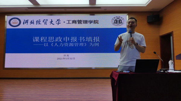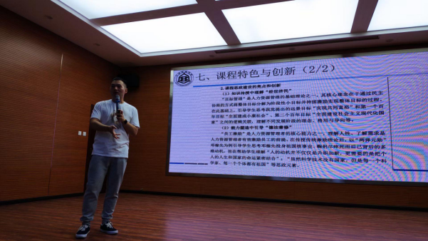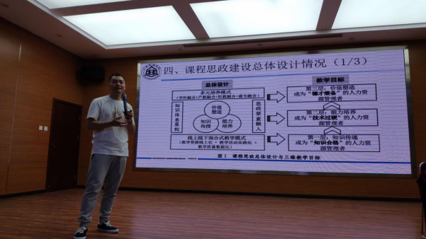 之后,许龙以《人力资源管理》课程思政申报书为例,结合申报书各部分内容进行细致讲解。该课程作为专业导论性课程,在整体建设思路中结合学校、学院办学目标与课程定位,利用互联网技术和新兴教学工具,以思政为引领,实现“知识合格”“技术过硬”和“德才兼备”的学生培养目标。以分别从教学内容、教学方式和教学质量评价等维度,讲解该课程的教学模式和教学过程。