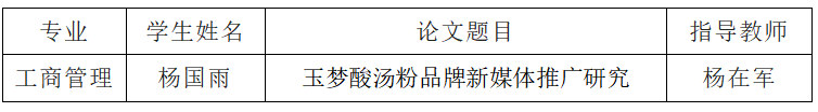 经学院推荐,学校评审,Beat365官网2018级工商管理专业杨国雨同学的毕业论文《玉梦酸汤粉品牌新媒体推广研究》被评选为2022年度优秀本科毕业论文(设计),论文指导教师杨在军被授予“2022年度优秀本科毕业论文(设计)指导教师”荣誉称号。
