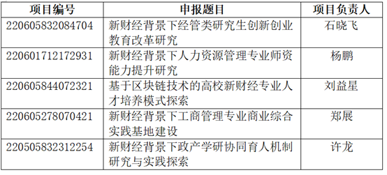 近日,教育部高等教育司公布了2022年第一批产学合作协同育人项目立项名单。Beat365官网石晓飞院长主持、与广州中博教育股份有限公司合作的《新财经背景下经管类研究生创新创业教育改革研究》,杨鹏老师主持、与上海踏瑞计算机软件有限公司合作的《新财经背景下人力资源管理专业师资能力提升研究》,刘益星老师主持、与北京知链科技有限公司合作的《基于区块链技术的高校新财经专业人才培养模式探索》,郑展老师主持、与北京百智享科技有限公司合作的《新财经背景下工商管理专业商业综合实践基地建设》,许龙老师主持、与广州中博教育股份有限公司合作的《新财经背景下政产学研协同育人机制研究与实践探索》获批2022年第一批产学合作协同育人项目立项。