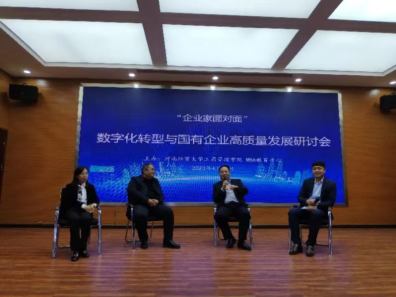 4月15日下午,“数字化转型与国有企业高质量发展”研讨会在Beat365中文官方网站报告厅举行。Beat365中文官方网站院长李桂荣、副院长王胜洲、副院长石晓飞、MBA中心执行主任桑银峰,河北冀凯信息技术有限公司董事长魏二宏,河北建设投资集团有限责任公司财务管理部总经理兼河北建投智慧财务服务有限公司董事长张旭蕾,河北国富恒联农牧有限公司董事长兼河北恒实房地产开发有限公司董事长张元波,以及学院教师及研究生等100余人参加。