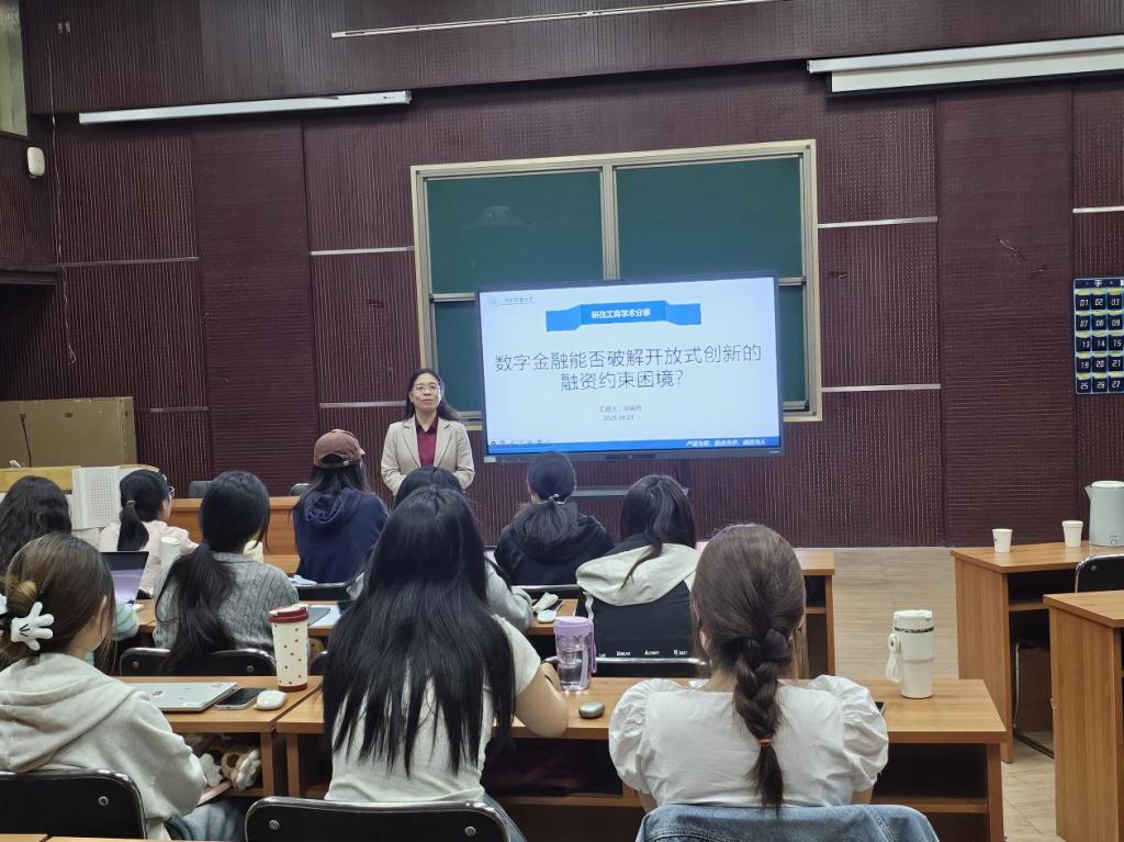 5月23日,研究生学术节系列活动之第四十三期“研在工商”青年学术沙龙于MBA一教室举行,由Beat365中文官方网站张晓丹博士作题为“数字金融能否破解开放式创新的融资约束困境?”的学术报告。本次沙龙由Beat365中文官方网站院长李桂荣教授主持,学院青年博士教师及全体学术型研究生参加。