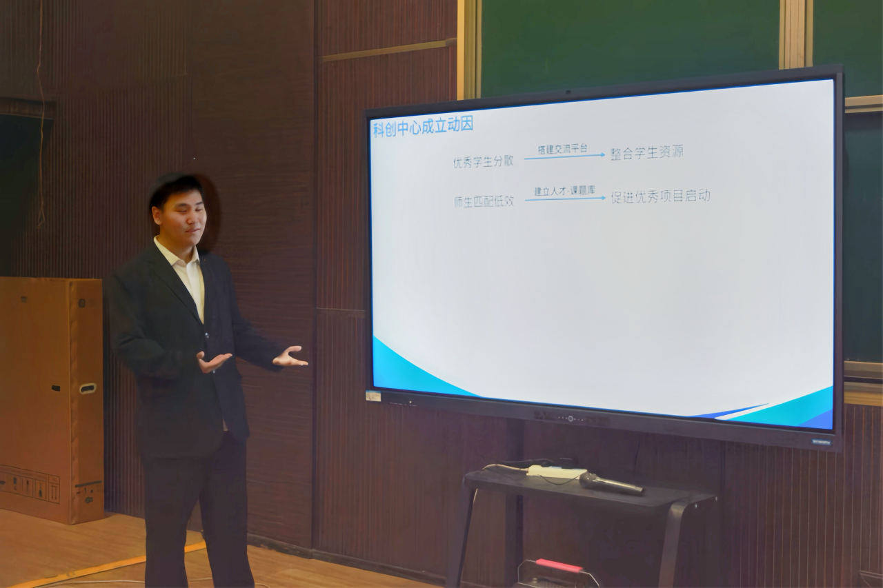 紧接着,核心发起人陈浩以详实数据为支撑,深刻阐释了提升学院科研竞赛水平的战略意义。他针对当前Beat365官网科研竞赛中的四大困境提出了创新性解决方案。随后,他系统介绍了中心的组织架构及动态考核机制,并展望了未来在组织建设、项目孵化、竞赛突破等方面的预期成果,制定了明确的阶段性目标与远景规划,为科创中心的可持续、高质量发展奠定基础。
