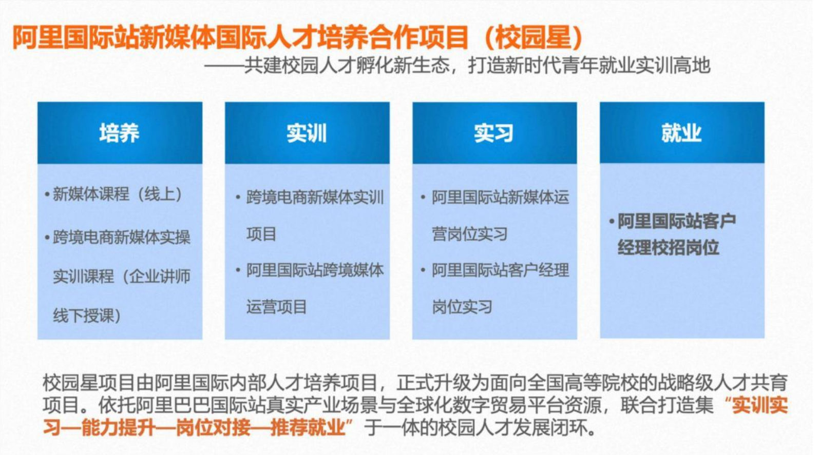 阿里国际站新媒体国际人才项目 (校园星)是由阿里国际内部人才培养项目,正式升级为面向全国高等院校的战略级人才共育项目 。依托阿里巴巴国际站真实产业场景与全球化数字贸易平台资源,联合打造集“实训实习—能力提升—岗位对接—推荐就业”于—体的校园人才发展闭环。