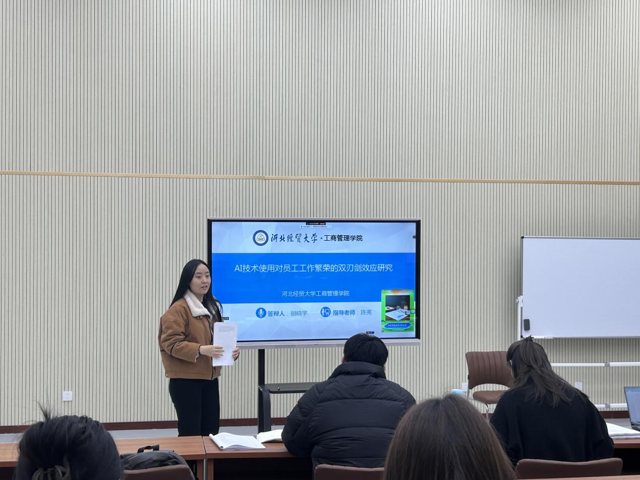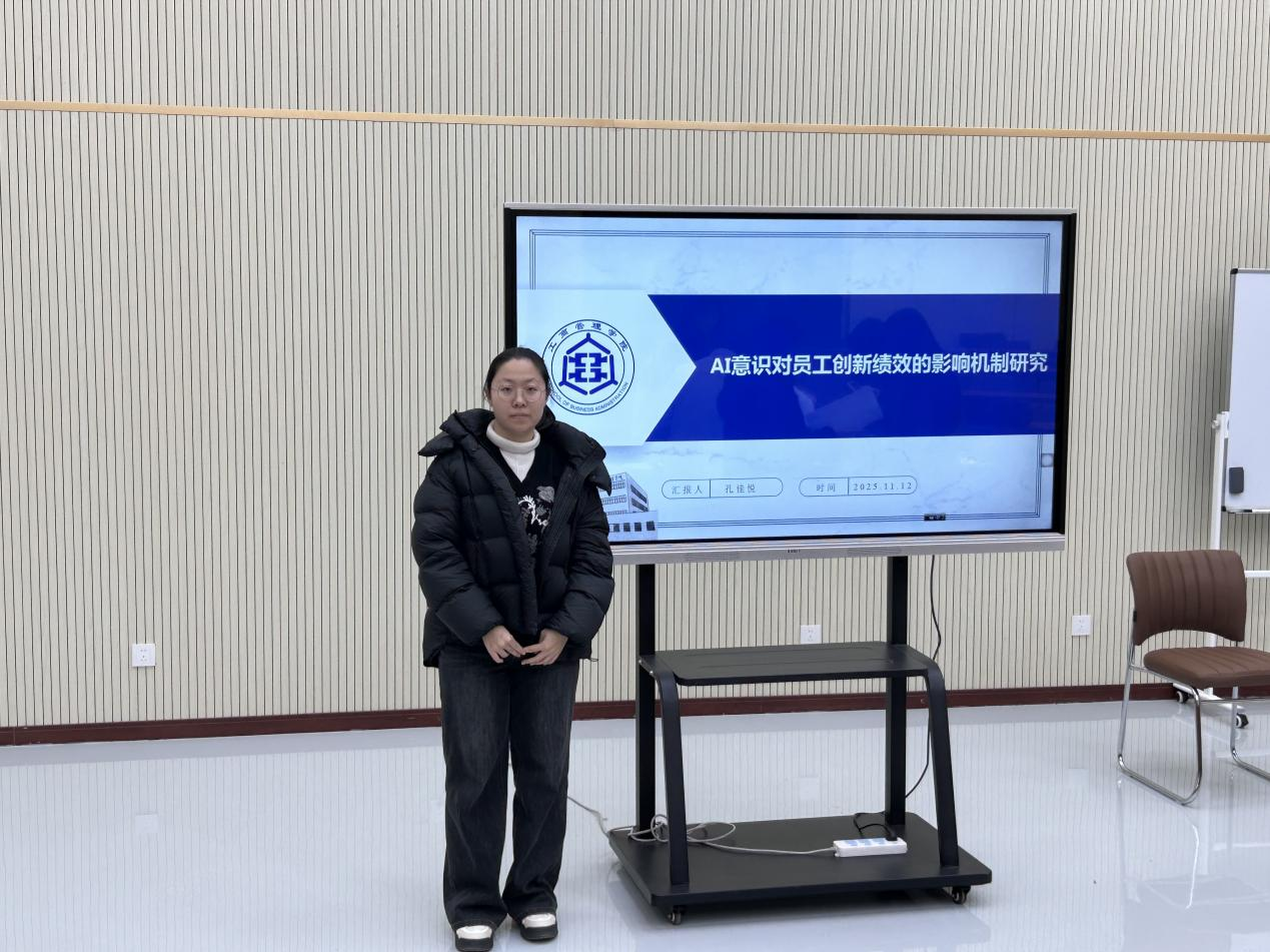 汇报人孔佳悦以“AI意识对员工创新绩效的影响机制研究”为题,从研究背景、理论基础与研究假设、研究设计、实证分析、研究结论与讨论五个方面展开汇报。研究以工作要求—资源模型为理论视角,基于648份有效问卷数据,验证了工作反刍在AI意识与员工创新绩效之间的中介作用,并揭示了组织AI准备度对该过程的调节效应。研究结果为人机协同情境下员工创新行为的内在机制提供了新的理论解释与管理启示。