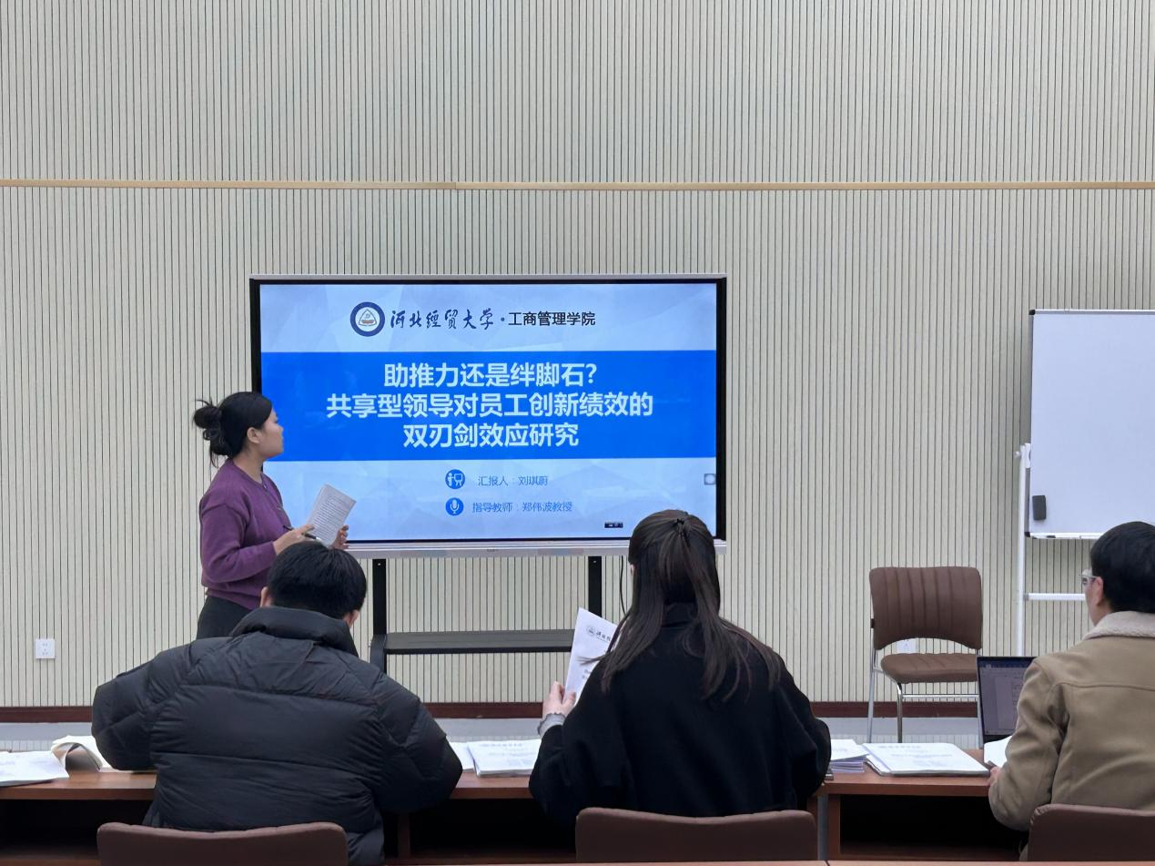汇报人刘琪蔚以“助推力还是绊脚石?共享型领导对员工创新绩效的双刃剑效应研究”为题,立足工作要求一资源模型,以双刃剑效应为核心视角,系统梳理共享型领导影响员工创新绩效的双重路径,试图厘清其在何种情境下成为推动创新的助推力,为组织科学设计共享型领导模式、精准激发员工创新潜力提供理论依据与实践参考。