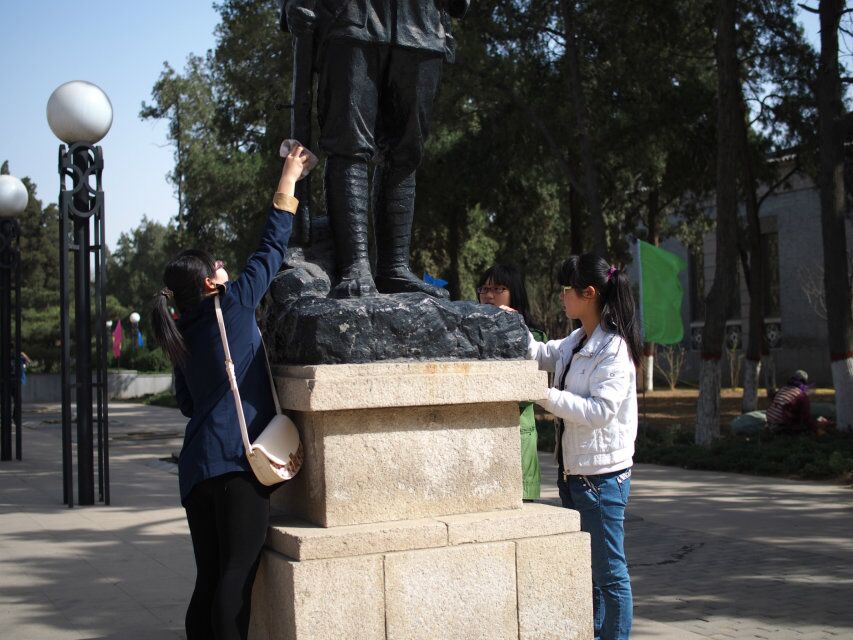 同学们在擦拭烈士雕像