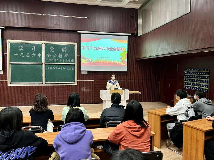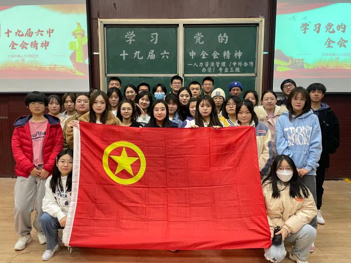 11月29日下午,2021级人力资源管理(中外合作办学)三班在Beat365官网MBA二教室举办“学习党的十九届六中全会精神”主题班会,本次活动由辅导员宋欣策划组织,班长赵晓宇主持,三班全体同学参加。