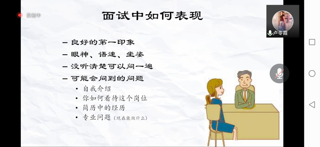讲座伊始,刘业对讲座的主题进行了介绍。随后,卢苓霞对应聘技巧进行讲解。
