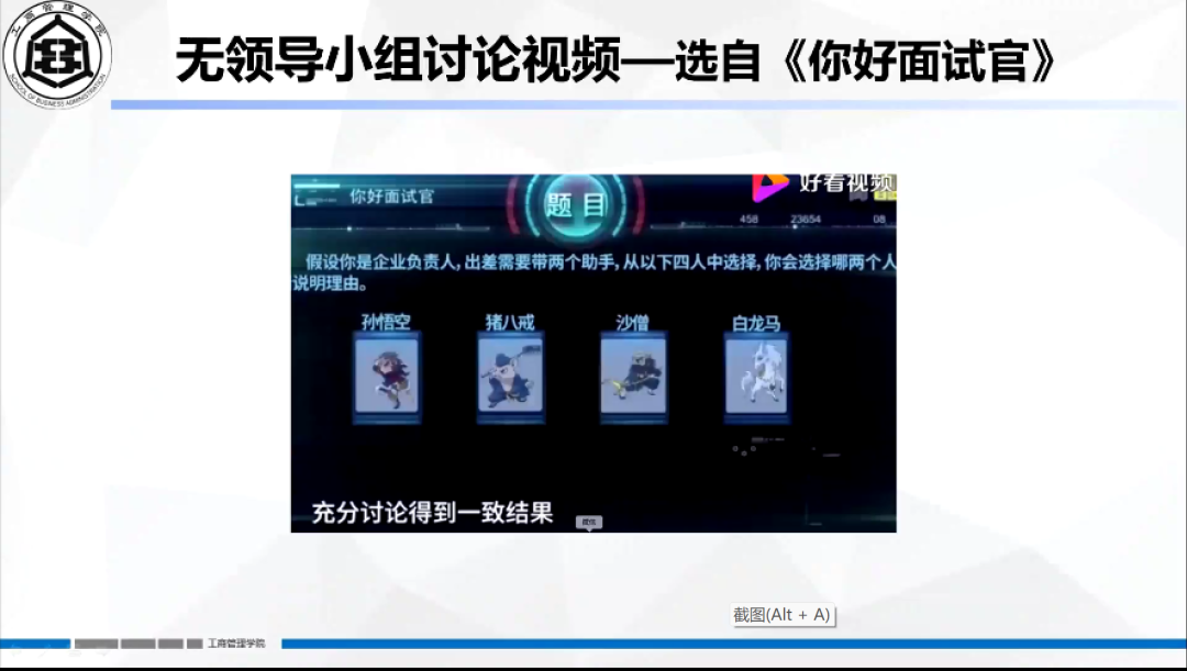 会议伊始,赵娜通过一道职场面试题目引出话题,同学们纷纷就此问题进行分析回答,赵娜积极与同学们进行互动。随后,赵娜又分别从行为了解和通过能力鉴别系统识别两方面,详细分析了HR面试如何判断应聘者的能力层次的问题。而在如何顺利应对面试问题上,赵娜提出其总结出的面试方法——望、闻、问、切,并对其一一详细解释说明。从而使同学们更形象的了解面试官面试方法,以供同学们提前做出相应的准备。最后,赵老师分别从无领导小组讨论概述、形式选择、角色选择、发言技巧以及过程要求五方面入手,通过视频短片的展示,向同学们讲解了无领导小组讨论技术。