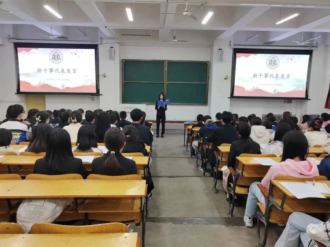 紧接着,主席团代表、中心负责人代表、新干事代表立足学生工作,结合自身经验进一步明确学生组织的服务宗旨,呼吁大家做合格的学生骨干,坚定政治站位,用心服务学生,培养自己的沟通交流、理论修养、宣传策划和组织协调能力,为学院发展贡献自己的力量。