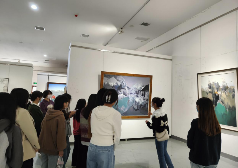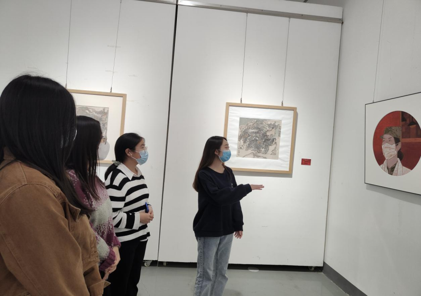 活动伊始,两位研究生学姐带领大家走进艺术馆大门,带领大家参观并解释画作的含义,刘冬晔老师的工笔人物画作品《守护》,刻画了一线医护人员的形象,致敬逆行者,感恩负重逆行的白衣天使。刘玮增老师的写意山水画作品《山水》系列,以太行山为题材,通过笔墨、线条、程式,勾勒自然之象,弘扬太行山精神。随后,同学们与学姐合影留念,活动圆满结束。