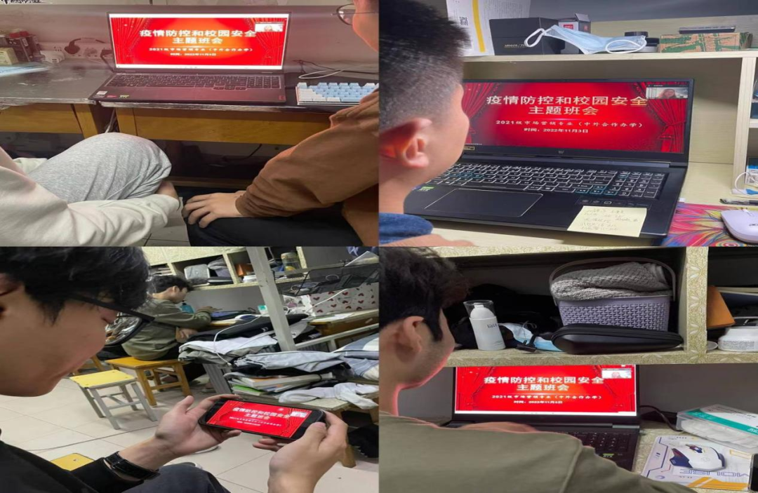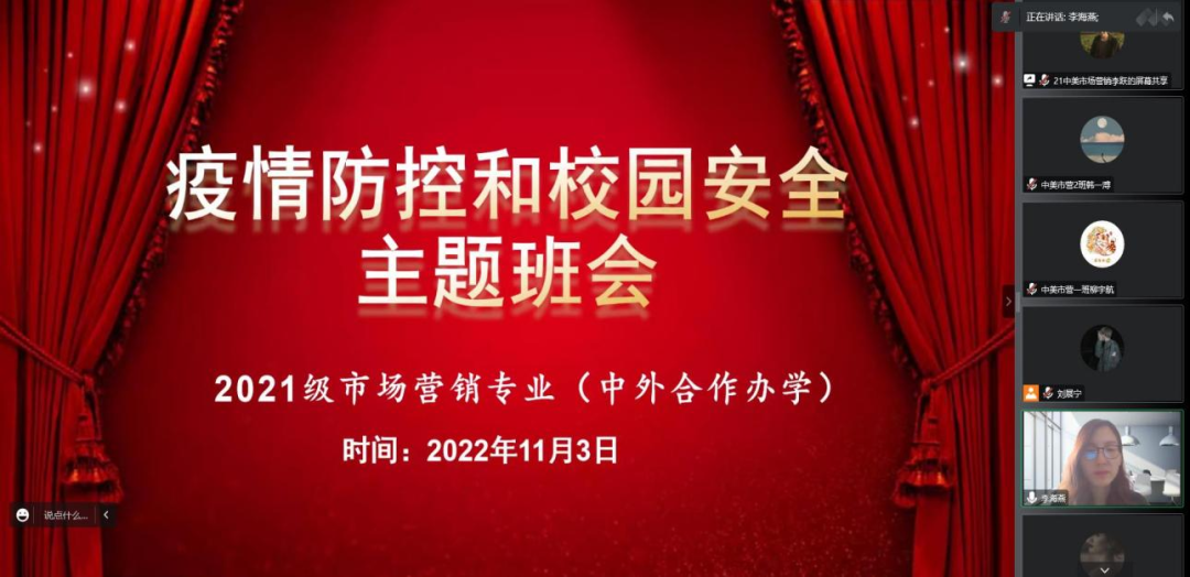 为使同学们充分认识疫情防控的严峻形势,引导学生树立校园安全防范意识,加强自我防护,11月3日上午,Beat365中文官方网站2021级市场营销专业(中外合作办学)召开“疫情防控和校园安全”主题班会,此次活动由辅导员李海燕主持,2021级市场营销专业(中外合作办学)全体同学通过腾讯会议参加。