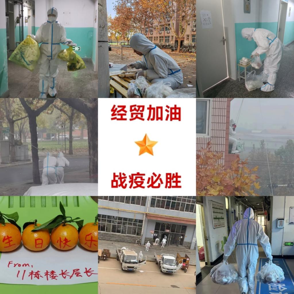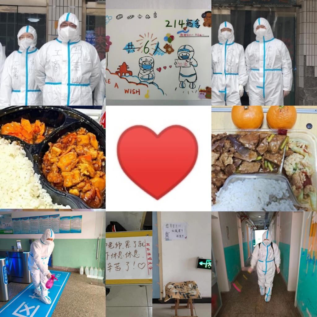 他们第一时间走向“战场”,义无反顾的化身守护学生的“大白”。他们是“外卖员”,学院领导和老师们齐上阵,为学生们配送一日三餐、生活用品,全力保障大家的基本生活;他们是“清洁工”,从五楼到一楼,不论是年长的老教授还是瘦小的女老师,都拎起大大的垃圾袋,用心维护干净清洁的宿舍卫生环境;他们是“守护神”,每层楼都有老师24小时值守宿舍,随时帮助学生解决突发状况。