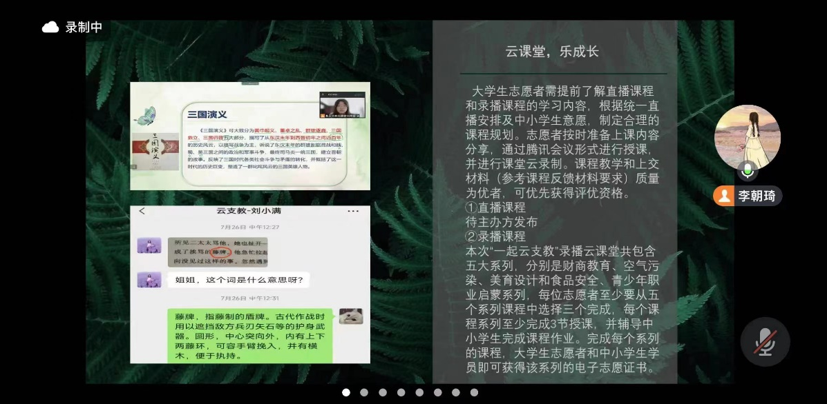 会议伊始,李朝琦简单介绍了此次支教活动目的和意义,重点介绍讲解了活动的操作流程和注意事项。随后,李朝琦从“趣运动,享时光”、“执书卷,悦人生”、“云课堂,乐成长”、“经贸特色活动”、“云研学,向未来”五个板块向志愿者们具体介绍此次活动的主要内容,让志愿者们对此次活动有了更深层次的了解。最后,李朝琦表示,“云支教”是一项具有深刻意义的活动,希望志愿者们能以高度的热情和饱满的姿态迎接此次“云支教”志愿活动,用青春和智慧为山村孩子搭建一个通往梦想彼岸的桥梁。