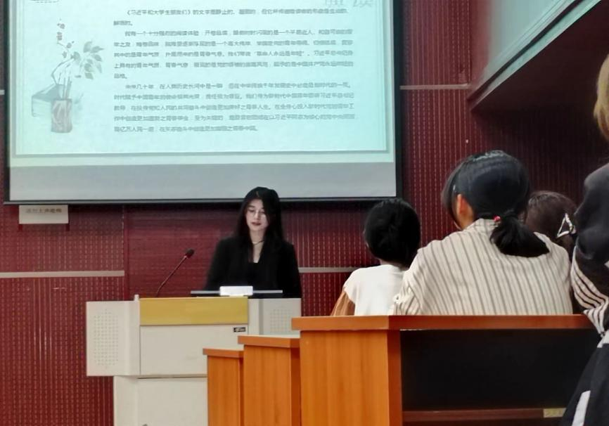 在读书分享中,2021级智慧工商一班王梦雨向我们分享了一本百读不厌的书籍——《习近平与大学生朋友们》。这本书中详细讲述了习近平同志在河北正定、福建、浙江、上海和到中央工作以来,与大学生们交往、交流、交心的故事,真实记录了他对青年学生始终如一的关注、关心、关爱,体现了党中央对青少年成长的高度关注。