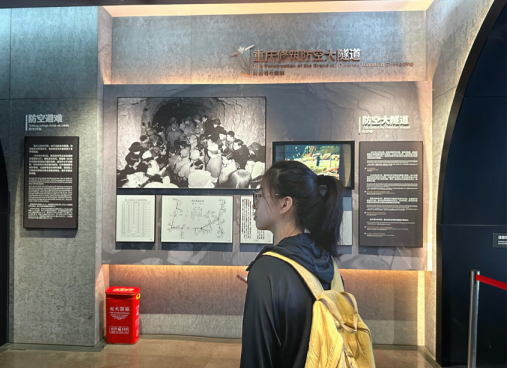 重庆大轰炸惨案遗址位于渝中区磁器口街,遗址纪念碑与周围繁华的闹市商圈形成了鲜明的对比,显得格外的庄重、肃穆。一走进序厅,我就被那雄壮激昂的《抗敌歌》和“重庆人民反轰炸精神永在”主题的雕塑墙拉入了那段苦难的日子。来到负一层,硕大的数字墙映入我的眼帘,墙上镌刻的文字触目惊心:“持续时间6年零10个月,直接伤亡32829人,财产损失100亿元法币......”这是大轰炸期间,日机轰炸造成的人员伤亡和财产损失数据。看着整墙的数字,我的心久久不能平静,那不是冷冰冰的数字,而是一段段让人痛心的回忆。如今,血与火已经远去,唯有幸存者不曾忘记,他们守望历史岁月的变迁,那时的硝烟化作今日的无言,无不在提醒世人勿忘历史。