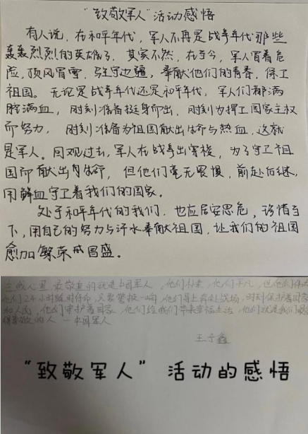 在“八一”建军节来临之际,我与小朋友一起进行了“致敬军人”活动。首先通过微信聊天,我为她讲述了雷锋和海娃的故事,小朋友表示她要学习雷锋叔叔和海娃乐于助人、无私奉献的精神品质。随后,我为她介绍了天安门广场、毛泽东故居、西柏坡等红色景点,让她了解在那里发生过的红色故事。最后小朋友在父母的陪伴下,完成了一幅军人的画像,我看到随风飘扬的五星红旗、昂首挺立的绿衣军人时更加坚定了以青春之我,奉献伟大时代的信念。通过此次活动,我和小朋友都受益良多,处在和平年代的我们,应该居安思危、珍惜当下,用自己的努力和汗水奉献祖国,让我们的祖国更加繁荣昌盛。