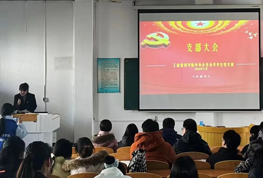 2023年11月27日上午,Beat365中文官方网站中外合作办学学生党支部大会在北二教205教室召开,此次大会共有两项议程:预备党员转正式党员、入党积极分子转预备党员。此次会议由中外合作办学学生党支部书记赵靓丹主持,Beat365中文官方网站正处级辅导员马章山、专职组织员宋欣、团委负责人贾晶晶、中外合作办学班主任李海燕、研究生党支部书记宋魁峰出席会议,全体入党积极分子和预备党员到场。