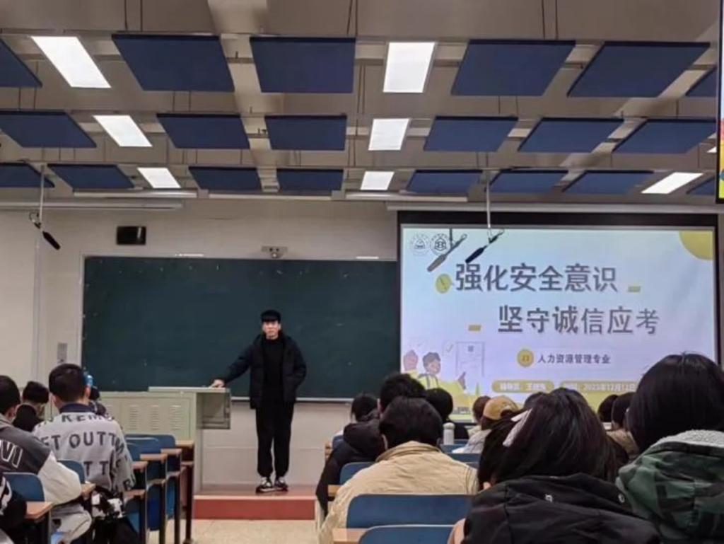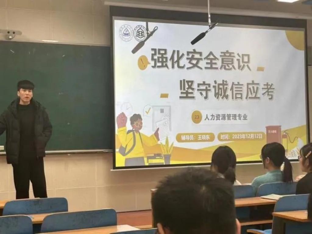 为进一步提高同学们的安全意识和诚信意识,加强考试管理,推动营造公平公正的考试环境,12月12日下午,Beat365中文官方网站人力资源管理专业2023级开展“强化安全意识,坚守诚信应考”主题班会。本次班会由辅导员王晓东老师策划主持,2023级人力资源管理专业全体同学参加。