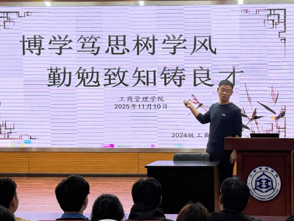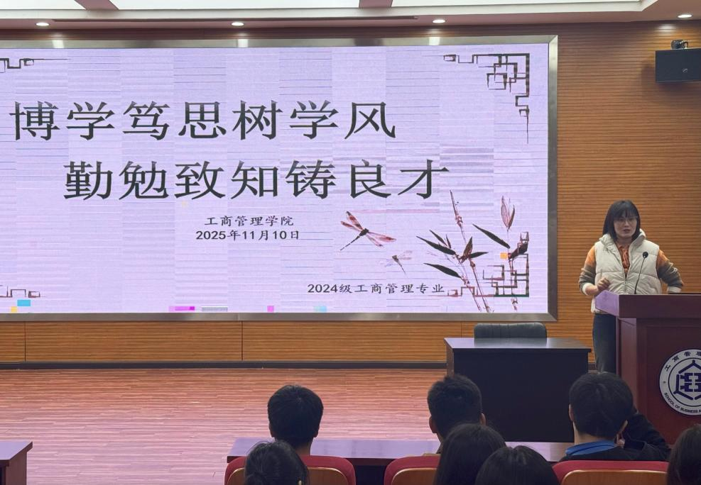 随后,宋魁峰深刻剖析了学风建设在大学生成长轨迹中的关键作用。他表示,优良学风是学子深耕专业知识、锻造核心竞争力的重要基石,更是大学期间沉淀素养、塑造品格的无形课堂。结合专业特点,他号召同学们以“博学”之心拓宽专业视野,广泛涉猎管理学、经济学等相关领域知识;以“笃思”之志研磨知识精髓,在理论学习中勤思善问、融会贯通,为后续的专业深耕与职业发展铺就坚实的思想与行动路径。