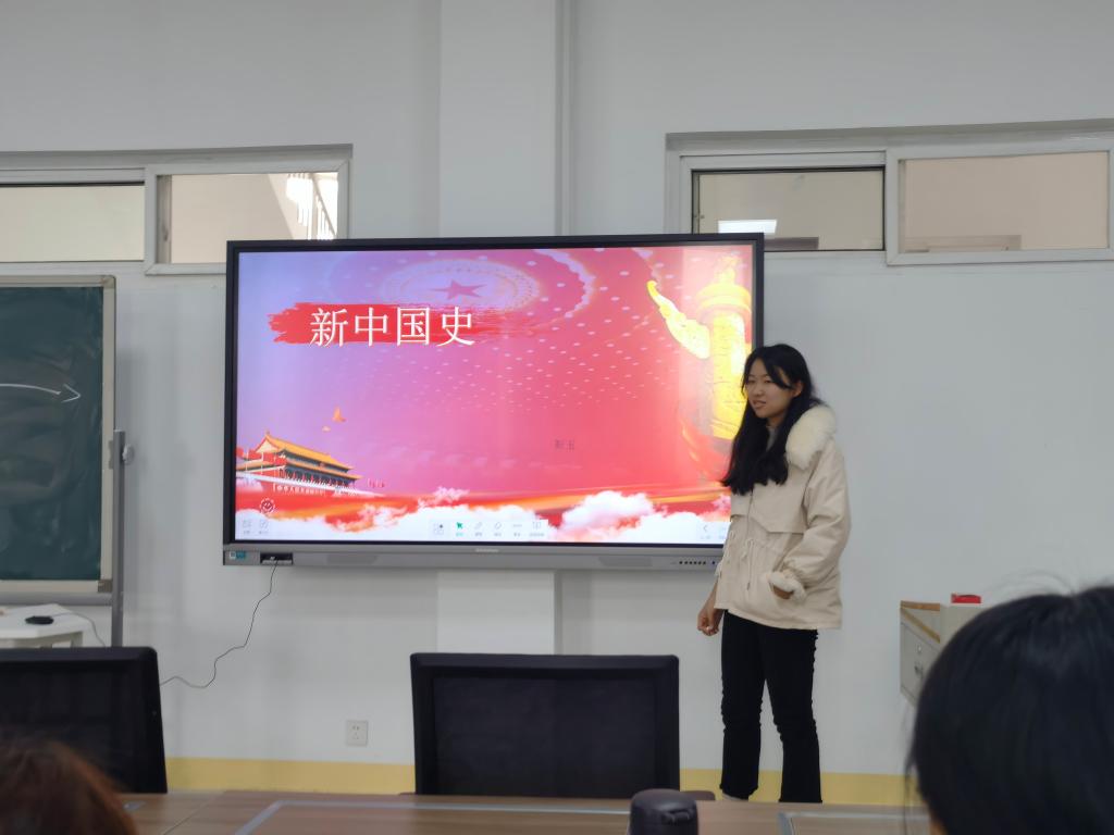 靳玉同志以一个精彩的视频“建国前中国共产党的光辉历程”展开此次演讲。中国共产党一路走来,充满着苦难和辉煌、曲折与胜利、付出与收获,这些风雨兼程是中华民族继往开来、奋斗前进的现实基础。无数革命先烈抛头颅、洒热血才换来今天的幸福生活,幸福生活来之不易,所以我们一定要学会珍惜。随后,讲述了中国72年的历史进程和伟大奇迹。在新中国成立之后,中国共产党一直在探索中前进,这个探索的过程是非常曲折的。我们党团结带领人民完成社会主义革命,建立社会主义基本制度,完成了中华民族有史以来最为深刻而伟大的变革,为当代中国一切发展进步奠定了根本政治前提和制度基础。社会主义制度建立之后,我们党领导人民开展大规模的社会主义建设,取得巨大成就,初步形成了比较完整的国民经济体系和工业体系,为后来的富起来奠定了基础。党的十一届三中全会之后,我们党果断地做出了改革开放的伟大决策,开辟了中国特色社会主义道路,使中国大踏步赶上时代。最后,她和同学们积极互动,分享了此次学习新中国史的心得体会。最后进行了总结,中国共产党经历了革命、建设、改革的长期考验,积累了丰富的历史经验。我们要通过学习新中国史,更好地领悟党在成长历程中经历的坎坷,从中汲取成功经验,将其继承下去、传承下去,进一步发扬光大。靳玉同志幽默风趣的讲解增加了新中国史学习的趣味性,让同学们再次深刻地学习了中国共产党的历史,提高了自己对党和国家的认识能力和处理实际问题的能力。
