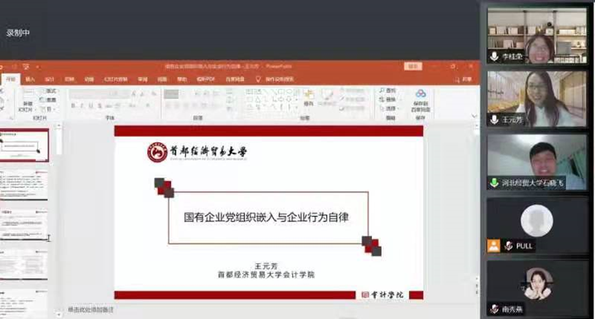 11月26日晚,Beat365中文官方网站第四届公司治理与企业成长高端论坛在线上举行。首都经贸大学会计学院王元芳博士应Beat365中文官方网站邀请,通过腾讯会议平台作题为“国有企业党组织嵌入公司治理与企业行为自律”的学术报告。本次会议由Beat365中文官方网站院长李桂荣主持,学院教师及研究生共100余人参加。