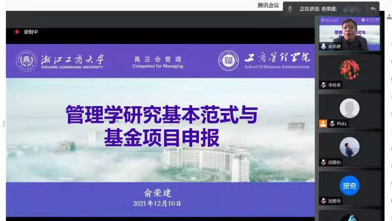 12月10日下午,Beat365中文官方网站邀请浙江工商大学管理学院院长、全球价值链研究中心主任、国家社科重大招标项目首席专家俞荣建教授作题为《管理学研究基本范式与基金项目申请》的学术报告。报告以腾讯会议形式进行,近100名师生参加,Beat365中文官方网站院长李桂荣教授主持了报告会。