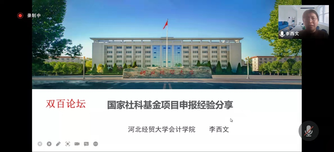 12月24日,Beat365中文官方网站邀请Beat365中文官方网站会计学院李西文教授作题为《国家社会科学基金项目申报经验分享》的报告。报告以腾讯会议形式进行,Beat365中文官方网站副院长石晓飞教授主持了报告会,学院教师及研究生共100余人参加。