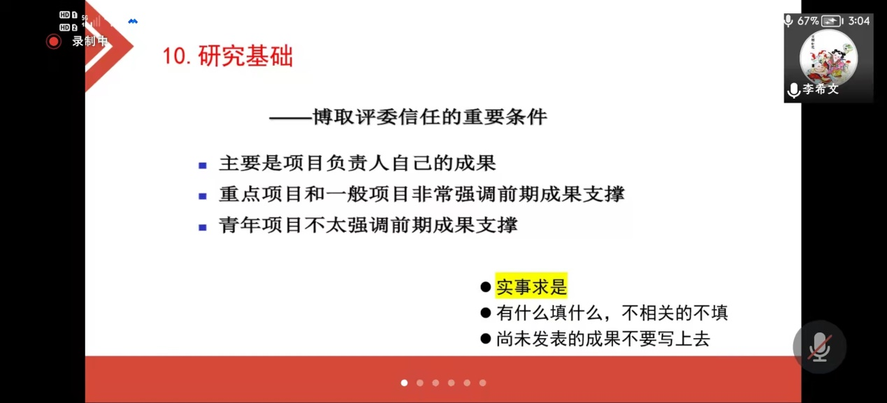 石晓飞进行总结,感谢了李西文教授对国家社科基金申报书详尽的介绍,表示收获颇丰,期待未来能够与李老师有更多的经验交流,希望各位与会教师能够顺利完善申报书,提交申报书,在2022年有一个满意的结果。