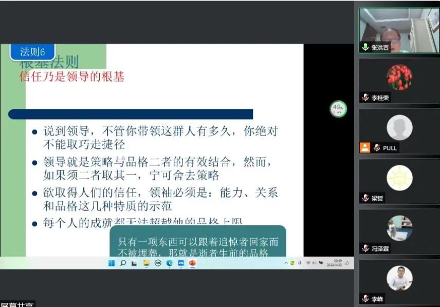 张教授以张艺谋在冬奥会开闭幕式的成功策划和陈一新在武汉防疫中发挥的巨大作用为例,指出领导力与权力并非正相关关系。首先,通过提出“什么是领导力?领导力的中心是哪个字?”两个问题引出领导力的概念。进而指出领导力的中心在于“力”,通过物理“力”的概念推导出领导力的内涵,即领导力包括大小、方向和作用点三个要素,从不同方面改变被领导者的行为状态(效率快慢、行动方向,两者至少有一个会改变)的效果(程度、质量、好坏、优劣)。其次,通过列举现实生活中的典型案例,帮助同学们更好地理解领导力。着重分析了郎平的领导力,指出专业能力、付出精神、和人格魅力构成了郎平强大的领导力。接着讲述了领导力的二十一个法则,强调了盖子法则,即领导能力决定一个人办事的成效水平;影响力法则,即衡量一个人的领导能力,着重观察他所发出的影响力。最后,张教授在线解答同学们在工作和学习中遇到的有关领导力的问题,告诫同学们,踏踏实实学习知识,做好知识储备,才能提升能力;将工作与学习结合,带着课题去学习,才能真正领略到MBA学习的魅力。