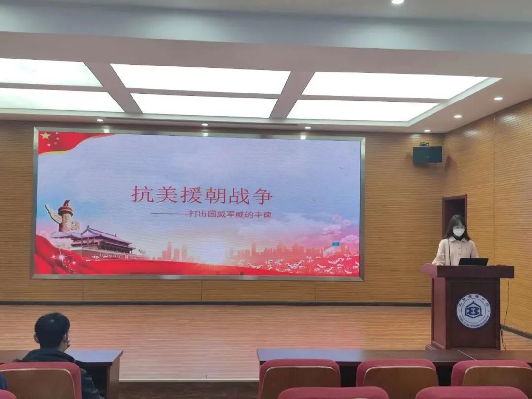 本次分享由2022级工商管理专业研究生贾浩苒同志作题为“抗美援朝战争——打出军威国威的丰碑”的报告。她以照片、文字的形式向大家展示了抗美援朝战争的全过程,介绍了以彭德怀等为代表的与抗美援朝运动时期有关的共和国元帅,并从词、曲的创作两方面讲解了《中国人民志愿军战歌》的诞生。最后,倡导同学们应自觉传承和弘扬抗美援朝精神,学习志愿军保家卫国的强大意志,希望同学们把这一伟大精神落实到科研实践中,知难而进、坚韧向前。通过贾浩苒同志的分享,大家对抗美援朝战争有了更全面的了解,对抗美援朝精神的内涵有了更深刻的把握。