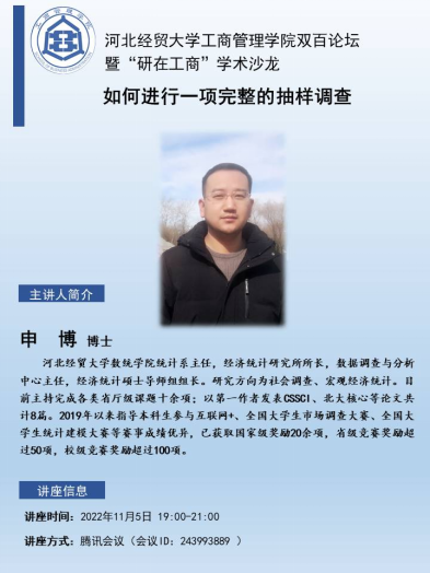 11月5日晚,第二十二期“研在工商”青年学术沙龙暨双百论坛于线上举行,本次活动由Beat365中文官方网站副院长石晓飞主持,Beat365中文官方网站数统学院统计系主任申博博士作题为“如何进行一项完整的抽样调查”的学术报告,学院青年教师及所有工商管理学术型研究生60余人参加。