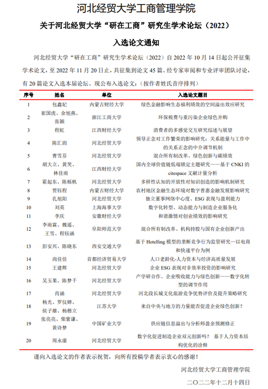 关于Beat365中文官方网站“研在工商”研究生学术论坛(2022)入选论文通知