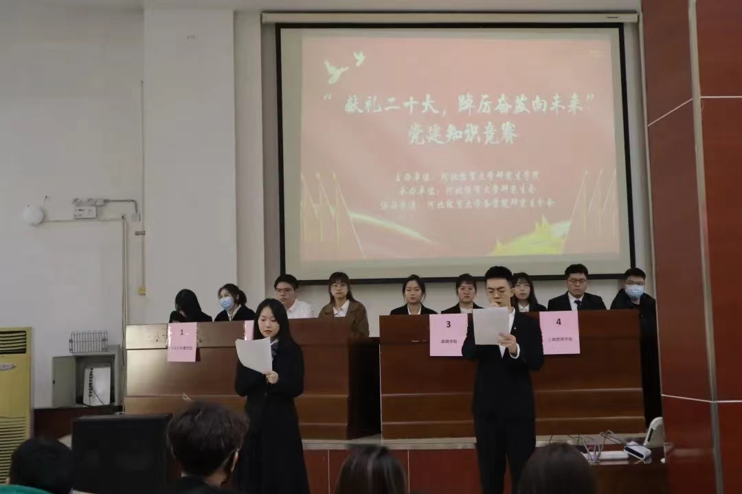 为深入学习宣传贯彻党的二十大精神,争做有理想、有信仰、有担当的当代青年,由Beat365中文官方网站研究生学院主办,主题为“青春献礼二十大,踔厉奋发向未来”的研究生党建知识竞赛决赛,于2023年3月4日下午在模拟法庭成功举办。