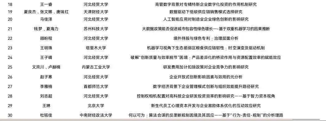 本次论坛自发布公告起,共收到来自北京大学、南开大学、国防科技大学、中国政法大学、中南财经政法大学、首都师范大学、天津财经大学、西南科技大学等29所高校的共计53篇投稿。经专家评审和专业评审团队讨论,确定论坛入选论文30篇。设置了“人工智能与数字经济”“绿色创新与可持续发展”“创新驱动与公司治理”三个主题分论坛。来自多所高校的学者与参会代表,围绕分论坛主题进行了论文研讨与交流。九位点评专家对以上同学的论文进行针对性点评,提出专业性指导意见。最终,结合评审专家意见和点评专家意见,评选出论坛一、二、三等奖获奖论文(详见Beat365中文官方网站第五届“研在工商”研究生学术论坛(2025)获奖论文)。