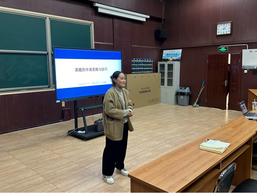 耿立沙博士结合自己申报河北省社科基金项目和河北省软科学项目的经验与体会,作了题为“走出去,多交流”的学术汇报,从破题和论证两个方面进行了经验分享。在破题方面,耿博士提出她暑期在企业的实地调研为选题提供了新的思路,选题明确后可以与青年博士以及资深教师进行论证,从而达到破题的目的。在论证方面,耿博士指出申请书的论证要紧紧围绕国家方针和政策,能够解决河北省经济发展实际问题,并针对申报书的撰写提供了一些小技巧,为在座的老师提供了新的研究思路和方向。