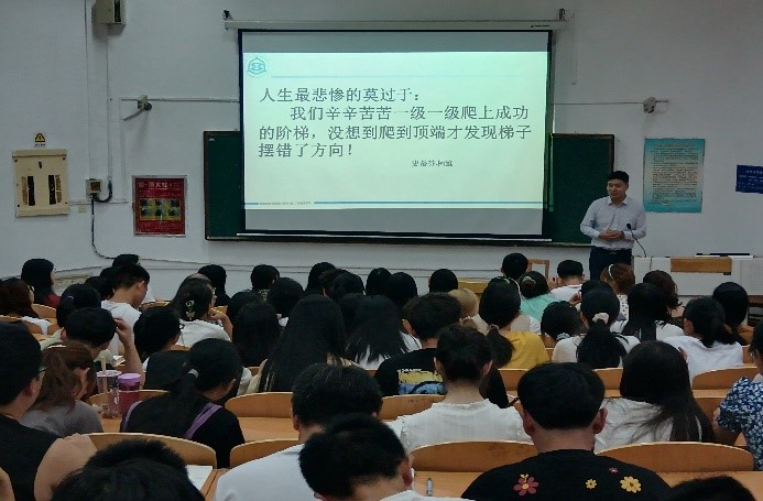 石晓飞分享了自己的大学经历并由此提出“为什么要考大学”、“大学四年怎么过”、“走出大学校门的那一天,你去哪”、“转专业?专业分流?”四个关键问题,引导同学们思考奋斗方向并积极交流发言。最后,石晓飞总结道:“人生最悲惨的莫过于我们辛辛苦苦一级一级爬上成功的阶梯,没想到爬到顶端才发现梯子摆错了方向!”