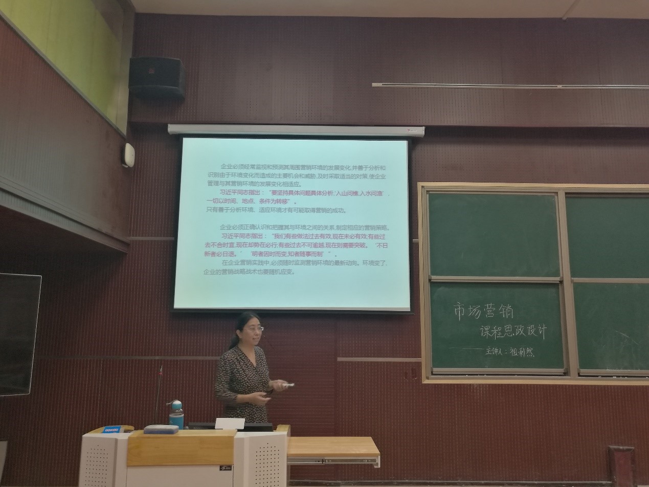 祖利然结合《市场营销学》课程,介绍了市场营销专业课程思政的目标、内容、原则和方法。首先,在思想观念上要确立 “育人”目的,深入学习贯彻习近平新时代中国特色社会主义思想,党和国家在政治、文化、社会、生态及党建方面的相关政策,从中挖掘思政元素,进而结合专业课程谈思想、说素养、讲故事,把思政教育渗透进学习过程的每一环节,包括培养方案、教材选用、课前预习、课堂教学、课后作业、案例讨论、社会实践等方面。其次,在将思政元素融入专业教学,运用马克思主义立场、观点和方法解释相关内容的同时,教师还要注重以德立身、以德立学、以德施教,为学生点亮理想的灯、照亮前行的路。最后,她以“宏观环境分析”一节为例,直观地展示了专业课程思政教学设计方案,并与参会教师进行了交流。