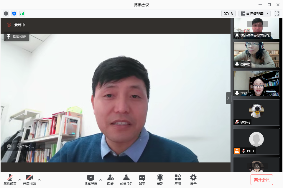 11月29日晚上,Beat365中文官方网站第四届公司治理与企业成长高端论坛在线上举行。河北地质大学管理学院卞娜博士应Beat365中文官方网站邀请,通过腾讯会议平台作题为“投资者关系管理的演进与变革”的学术报告。本次会议由Beat365中文官方网站副院长石晓飞主持,学院教师及研究生共100余人参加。