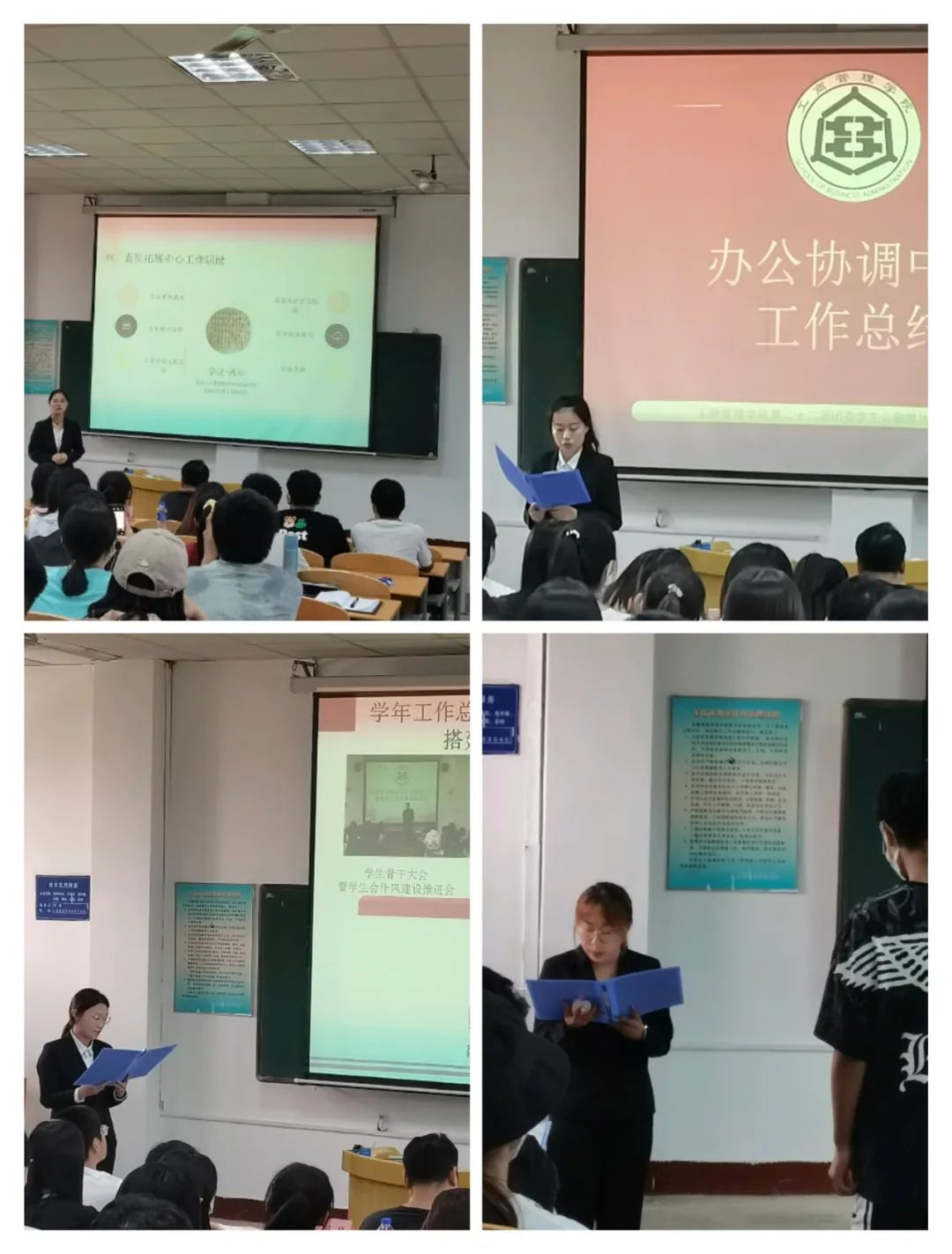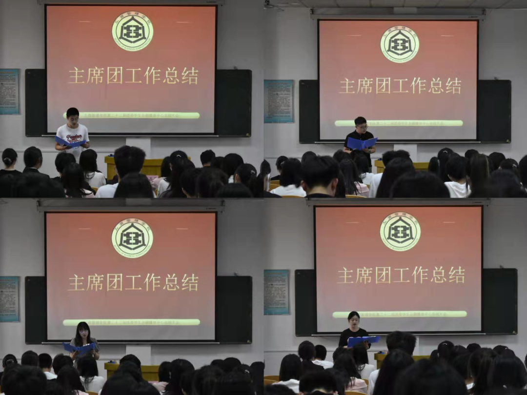 随后,由学生会主席团作工作报告,各位主席依次上台汇报一年的工作总结。他们表示,学生会过去一年活动的成功举办,是老师和各位学生会干事的共同努力的成果,衷心感谢领导和老师的大力支持,感谢全体成员的辛苦付出,并对各位成员寄予期待与祝愿。