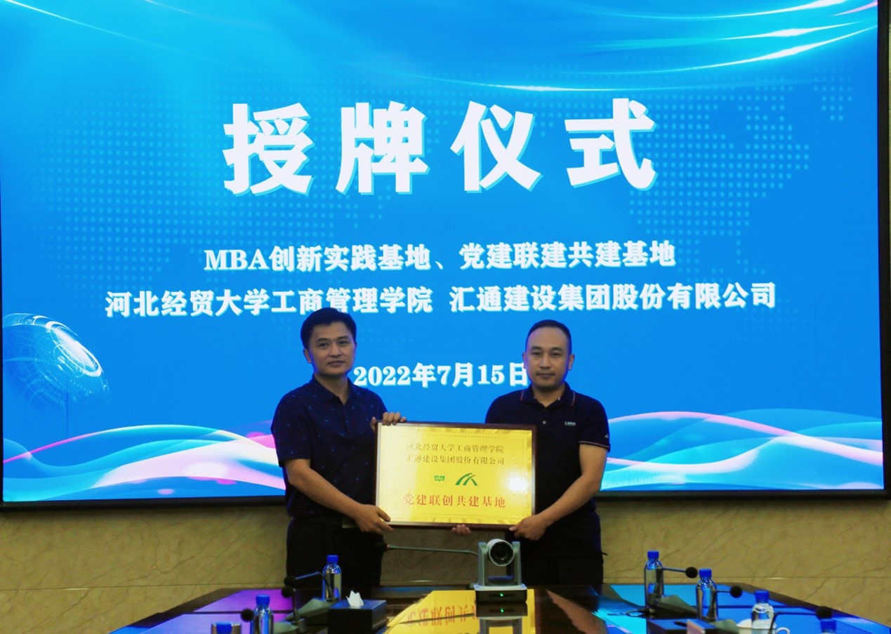 为进一步提高学院办学水平,发挥人才和智力优势,服务地方经济和社会发展,发挥学院与社会企业在人才培养上的互利互惠优势,7月15日,Beat365中文官方网站与汇通建设集团股份有限公司(以下简称“汇通集团”)在保定高碑店市汇通集团总部签订校企合作协议并举行授牌仪式。学院党委书记张霖、院长李桂荣、专职组织员宋欣、MBA中心办公室主任何伟,汇通集团总裁张忠山、集团党委副书记王治云、财务总监肖海涛、人力资源部、办公室等部门负责人及经贸大学毕业生代表出席。