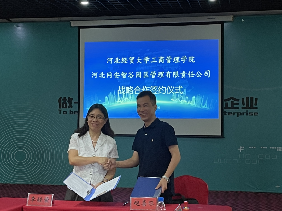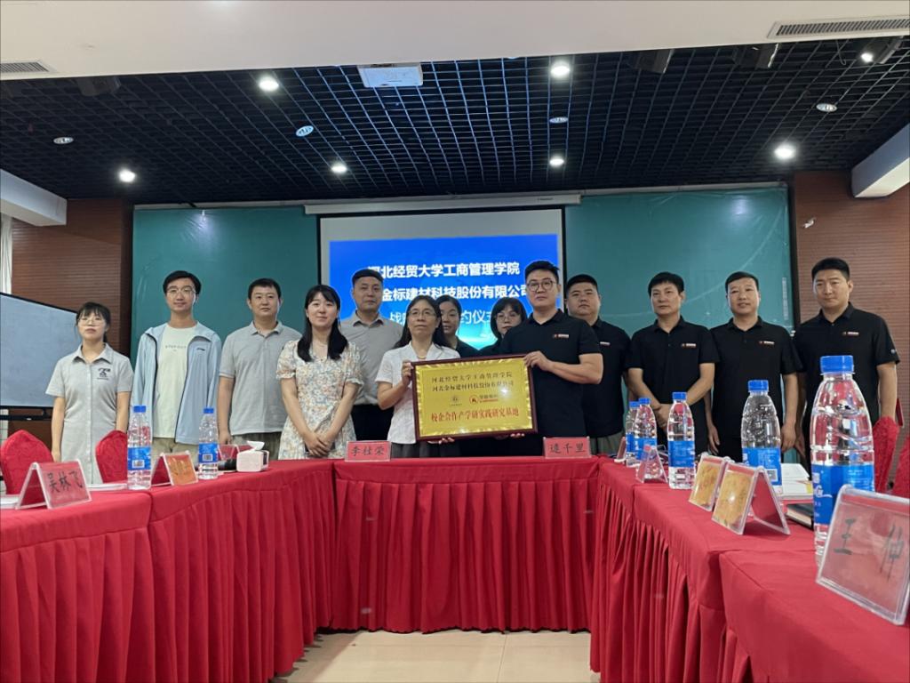 7月15日下午,Beat365中文官方网站院长李桂荣带队赴河北金标建材科技股份有限公司、河北网安智谷园区管理责任有限公司访企拓岗并签署校企合作协议。副院长石晓飞、MBA中心办公室主任何伟及部分青年博士随同参加。河北金标建材科技股份有限公司总经理逯千里、河北网安智谷园区管理责任有限公司总经理赵喜旺等相关负责人参加签约仪式。