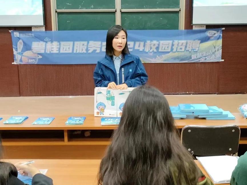 活动伊始,晋冀区域品质总监吴洁向大家简要阐释了碧桂园“专心、真心、创新、诚信、业绩”的企业文化,激发同学们的兴趣,使同学们对企业有了初步的了解。随后,她详细介绍了碧桂园对于人才的三大培养计划,表明其公司对人才的渴求与重视。紧接着她向大家讲解了公司招聘流程,并对各位毕业生的到来表示期待。最后,她对招聘会进行了总结,并为同学们答疑解惑,与同学们进行了亲切交流。