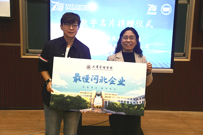 交流会上,2021届MBA校友、河北热点科技有限公司总经理谢畅向学院捐赠了XR数字名片。随后广大校友亲切交流,纷纷表示在学院学习期间,从思维方式、学习习惯等方面都有了大的提高,毕业后的成长蜕变,重返母校后的感慨万千,感染了每一位在校生。