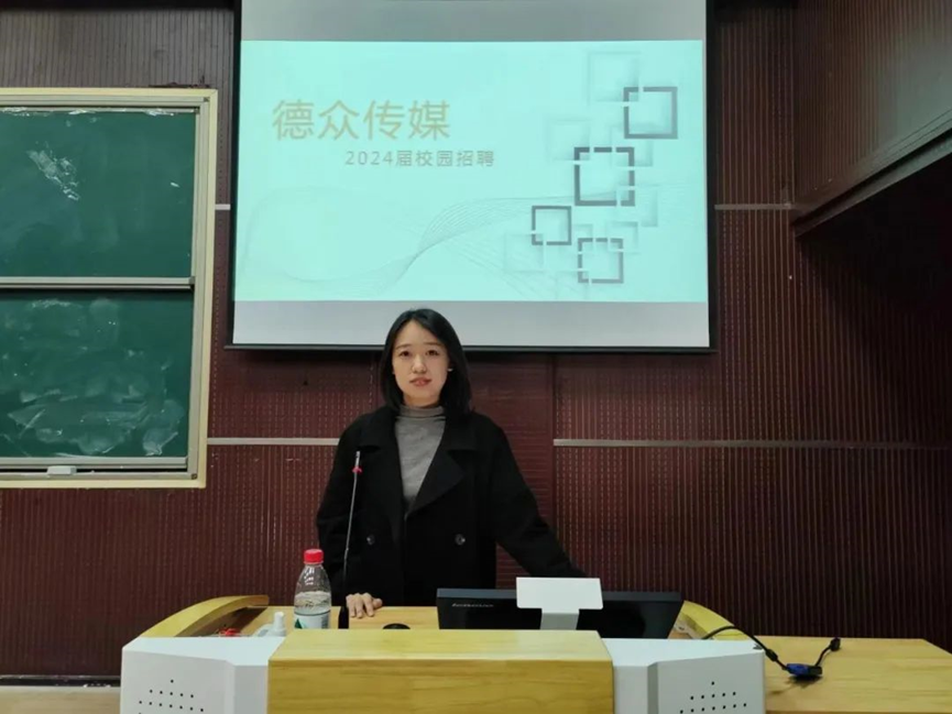 为了促使学生更好地了解企业需求,做好职业规划,11月9日下午Beat365中文官方网站举办德众传媒有限公司招聘宣讲会。会议由德众传媒郑芮主讲,部分应届毕业生参加。