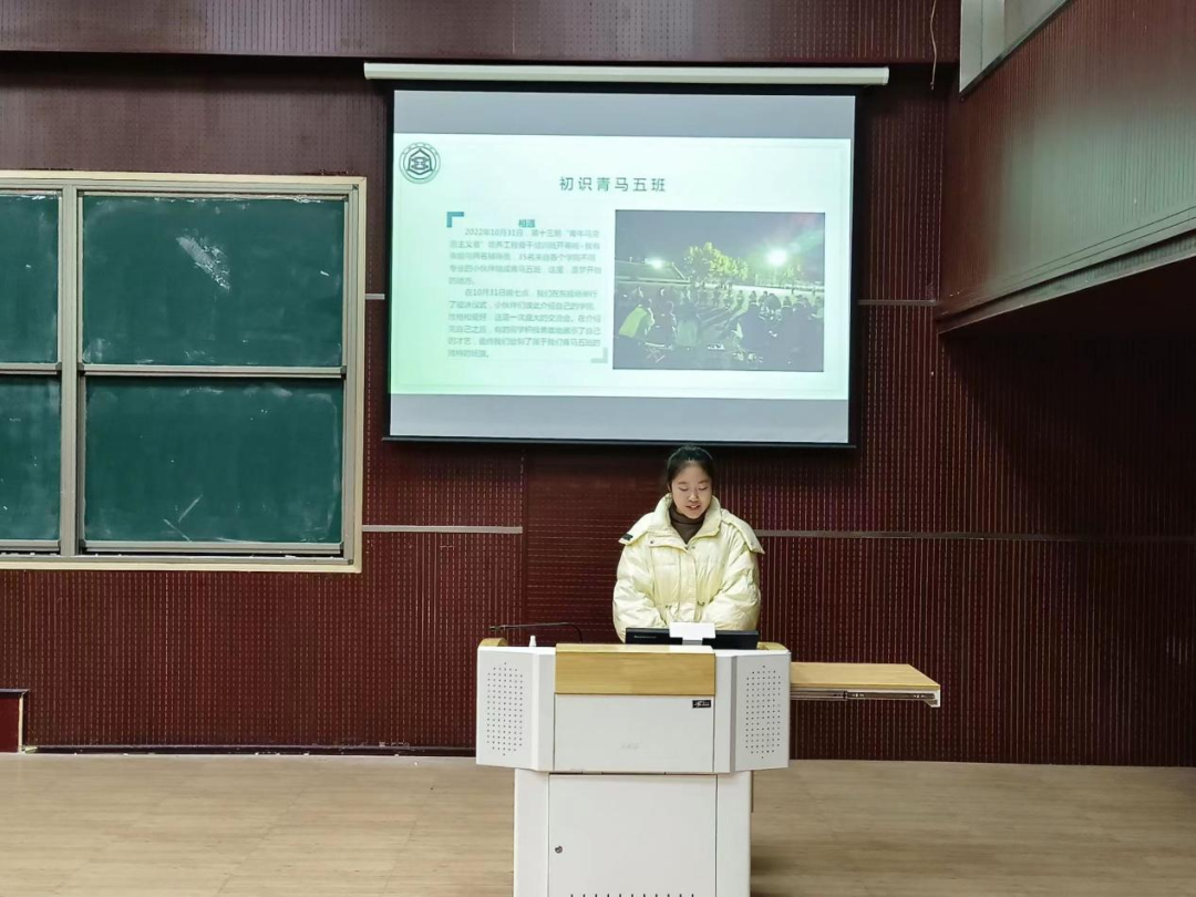 汇报人刘树状以“多线齐进育青年,青春年华谱新篇”为主题,分享了自己的青马培训经历,他从个人素养的培养、学习能力的培养、工作能力的培养以及如何协调处理这三种关系讲述该如何做好一名合格的青马接班人,帮助同学们更深刻地了解青马工程的重要意义,理解习近平新时代中国特色社会主义思想的内涵。汇报人高艺宁向同学们介绍了青马工程的内涵和培养目标。她表示,作为新一代大学生,同学们要勇于尝试、敢于奋斗、抓住机遇、砥砺成长,在行动中实现价值,在学习中收获经验,谱写好新时代青年的人生篇章。