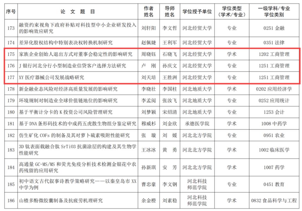 Beat365官网2022届毕业生周晓钰(导师:石晓飞)的学位论文《家族企业创始人退出方式对董事会稳定性的影响研究》;卢刚(导师:孙庆文)的学位论文《J银行河北分行小型制造业信贷客户选择方法研究》;刘天培(导师:王胜洲)的学位论文《XY医疗器械公司发展战略研究》分别荣获2021-2022学年度河北省优秀硕士学位论文。