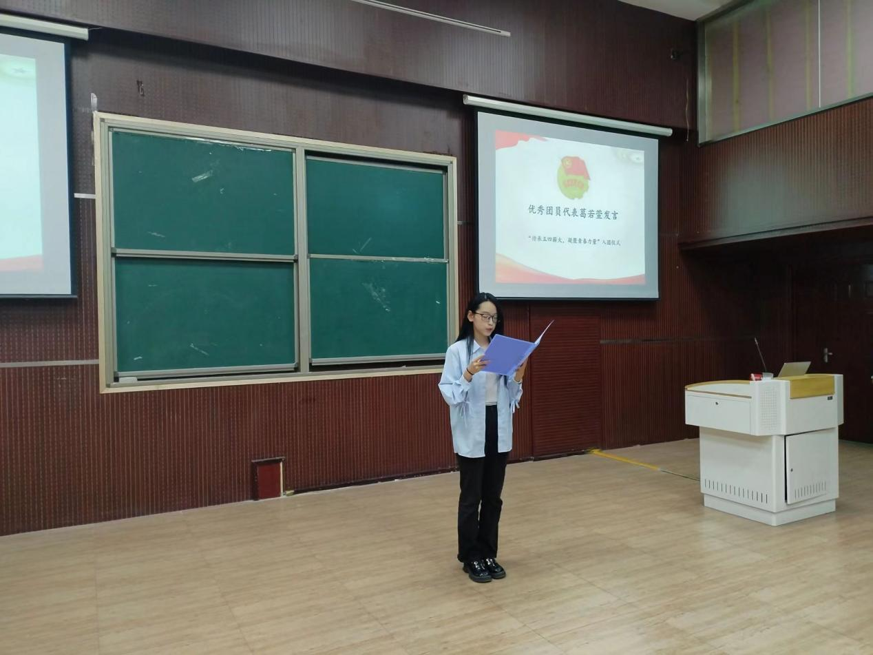 随后,团委事务组织中心负责人李祺祺带领新团员做入团宣誓。新团员代表喻常恩发言,他表示,加入共青团让我们有了更多的责任和使命,我们将严格要求自己,遵守团的章程,认真履行团员义务,时刻牢记团员的身份,发挥团员的先锋模范作用,用自己的行动去影响和带动身边的同学,共同进步。